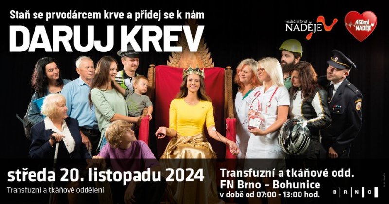 Fakultní nemocnice Brno a její Transfuzní a tkáňové oddělení se i letos zapojuje do celostátní kampaně „450ml NADĚJE“, která je zaměřena na osoby, které o darování krve uvažují, ale stále se pevně nerozhodly.