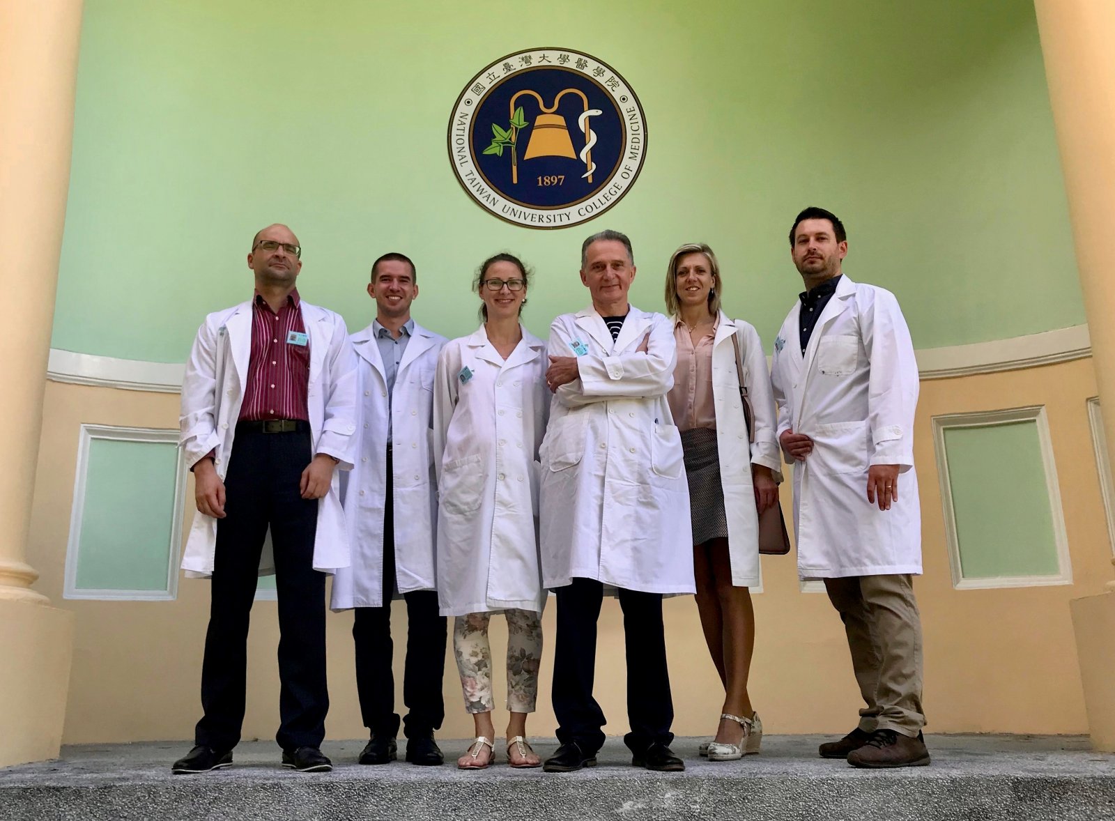 Na půdě Lékařské fakulty Univerzity v Taipei zleva doprava: MUDr. Robert Vach, MUDr. Petr Moravčík, MUDr. Alžběta Kodýtková, doc. Teodor Horváth, MUDr. Markéta Španková, MUDr. Kamil Hudáček.