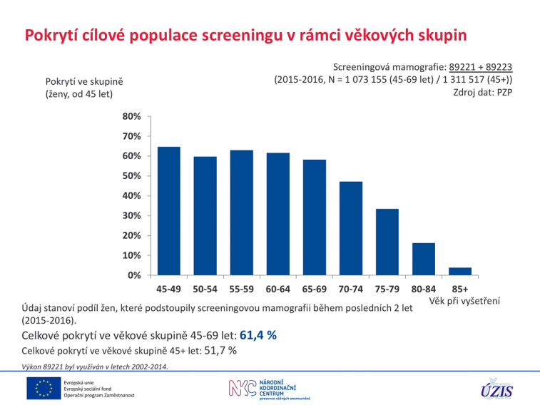 Od oficiálního zahájení screeningu v České republice do r. 2010 bylo vyšetřeno celkem 3 056 907 žen. U těchto vyšetřených žen bylo zachyceno 14 914 karcinomů prsní žlázy, přičemž více než 70 % z těchto zachycených karcinomů se nacházelo v časných stádiích (T1 a Tis). Ve většině případů tedy v časných stadiích s dobrou prognózou.