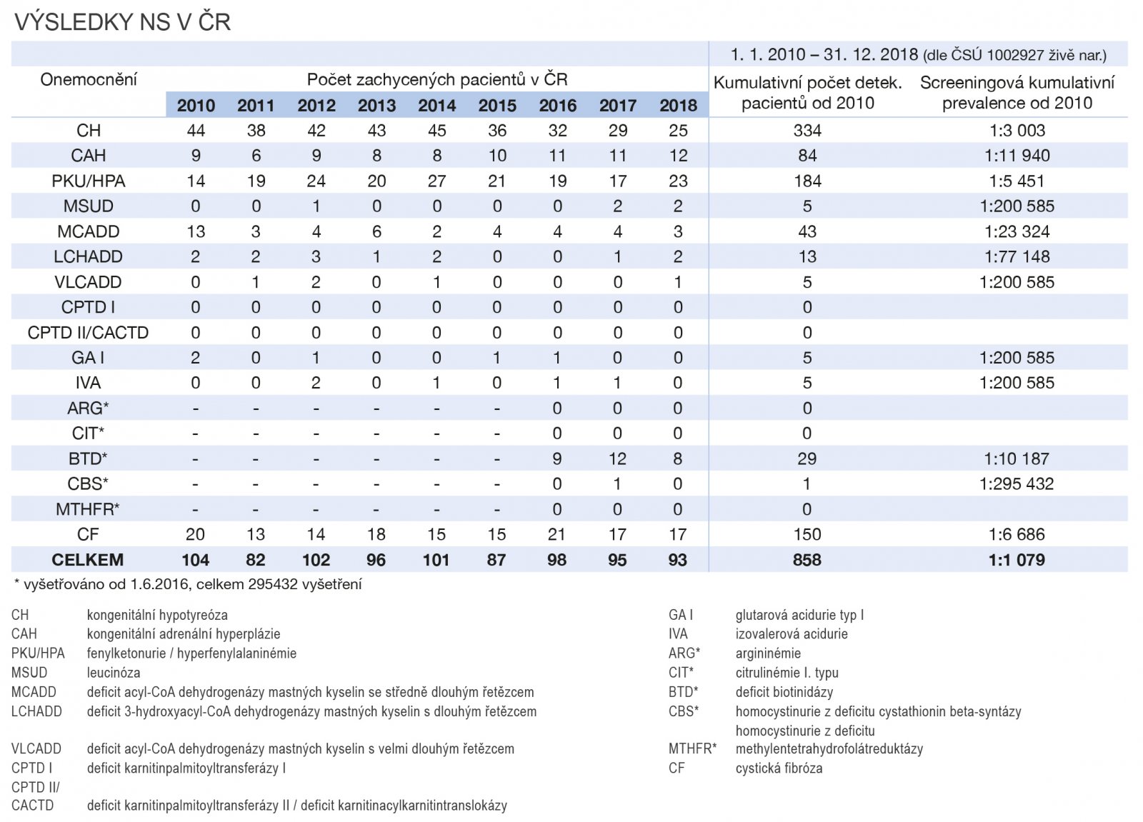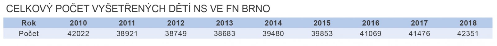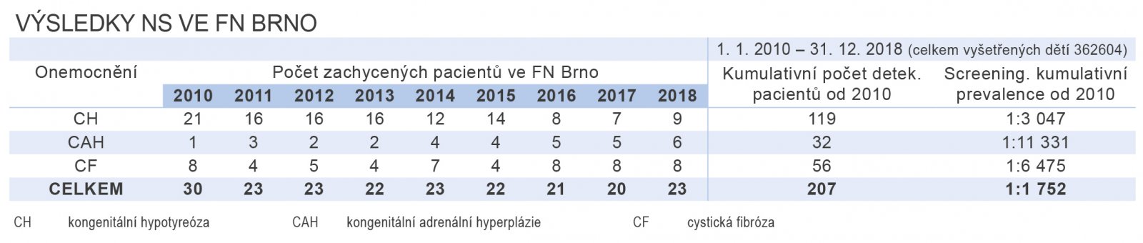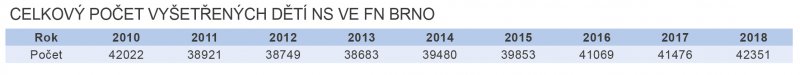 Následující tabulky zachycují výsledky NLS od r. 2010 a to jak za celou ČR, tak i v rámci FN Brno.