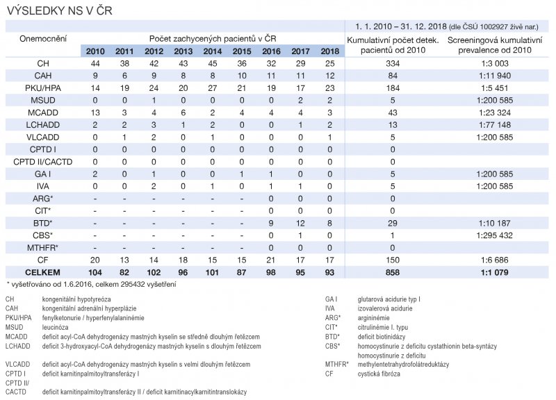Pravděpodobnost, že novorozenec bude trpět některou z 18 chorob vyhledávaných NLS je přibližně u jednoho z 1 079 narozených dětí. Jak je patrné z prezentovaných dat, nejčastěji se vyskytujícími chorobami vyhledávanými prostřednictvím NLS jsou kongenitální hypotyreóza, fenylketonurie, kongenitální adrenální hyperplazie a cystická fibróza. Ostatní onemocnění se vyskytují mnohem vzácněji. Všem zachyceným dětem však včasné odhalení choroby prostřednictvím NLS pomůže ochránit zdraví a v některých případech i život. Novorozenecký laboratorní screening je tedy velmi účinným nástrojem sekundární prevence celé řady onemocnění, která řadíme mezi tzv. vzácná onemocnění.