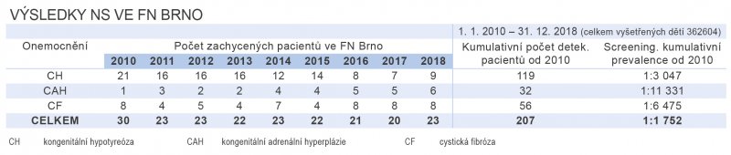 Ve FN Brno na Oddělení klinické biochemie v Dětské nemocnici se provádí vyšetření NLS pro tři onemocnění: kongenitální hypotyreózu, kongenitální adrenální hyperplazii a cystickou fibrózu pro novorozence z regionu celé Moravy. U přibližně jednoho procenta dětí pak musí být provedeno vyšetření druhého kroku cystické fibrózy, který je pak realizován z téže novorozenecké kartičky na Oddělení lékařské genetiky FN Brno.