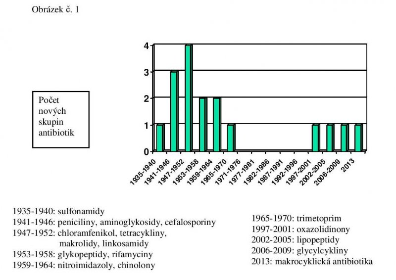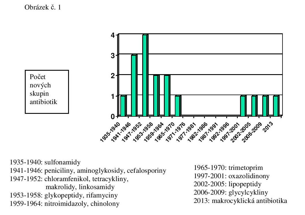 Izolovat penicilin se podařilo až v roce 1940 chemikům Chainovi a Floreymu a v průběhu druhé světové války byl pak dodáván armádě pro léčbu raněných vojáků. V poválečném období nastal boom ve vývoji nových antibiotik a do sedmdesátých let dvacátého století byla vyvinuta většina skupin v současnosti známých antibiotik (obrázek č. 1). Řada dříve fatálních infekcí se zařadila mezi choroby, které je možné při včasné diagnostice vyléčit bez následků. Infekční choroby se postupně začaly považovat za vyřešenou záležitost, antibiotik pro klinické využití byl dostatek a rezistence baktérií vůči antibiotikům byla nízká. Vývoj nových skupin antibiotik nebyl potřeba.
