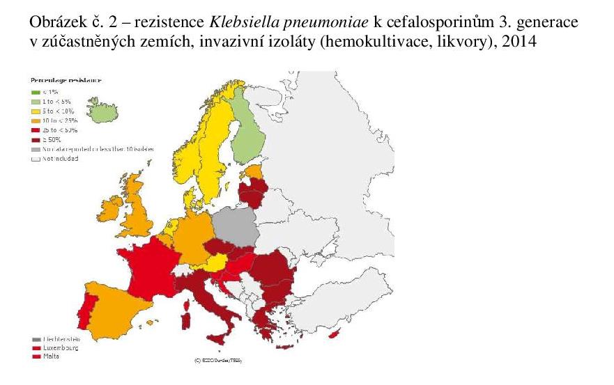 Ve skupině gramnegativních baktérií je ale situace horší. Poměrně vysoká je například rezistence E. coli k fluorochinolonům, ještě horší je situace u Klebsiella pneumoniae –  rezistence invazivních izolátů v této skupině baktérií  k některým antibiotikům (např. cefalosporiny) přesahuje 50% (obrázek č. 2). Nejobávanější jsou pak kmeny enterobaktérií s produkcí karbapenemáz – karbapenem degradujících enzymů, které štěpí všechna betalaktamová antibiotika, včetně rezervních karbapenemů. Tyto bakteriální kmeny zůstávají často citlivé pouze vůči kolistinu a některému z aminoglykosidů, popřípadě samotnému kolistinu. Terapie infekcí vyvolaných těmito baktériemi je pak velmi obtížná.