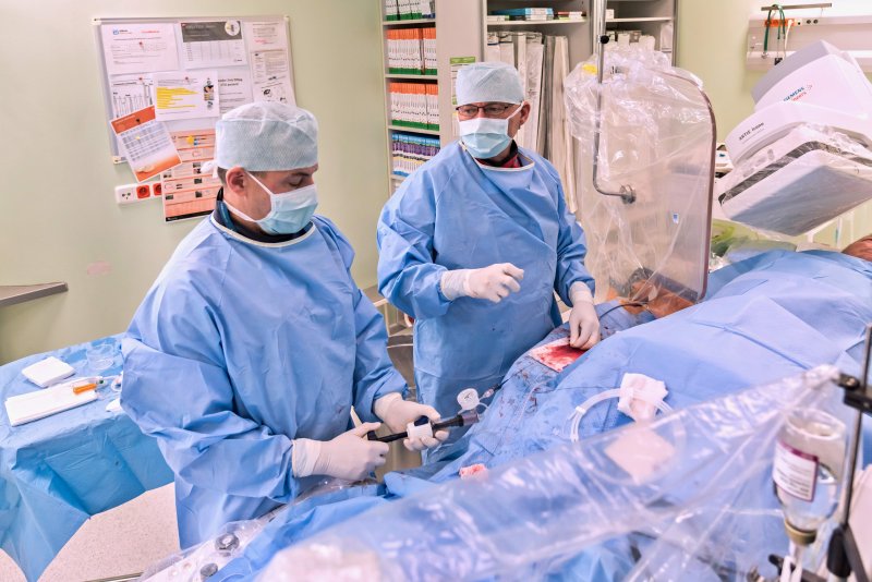 „Množství vápníku v cévní stěně si lze laicky představit jako hodně tvrdou trubku, kde běžné postupy, například balonková dilatace sloužící k roztažení zúžených úseků či implantace stentů, nestačí. Proto jsme v prvním kroku museli odbrousit povrchový vápník, dále jsme ho ultrazvukem rozbíjeli a ve třetím kroku, který jsme však neplánovali, ale museli jsme jej využít, bylo provedeno roztažení cévy novým balonkovým systémem, který se nazývá Lithix, a který rovněž vápník v cévě narušuje, Finálně jsme do zúžených míst implantovali dva lékové stenty a optimalizovali jejich roztažení a pacient vše výborně zvládl a během výkonu jsme s ním vše probírali,“ komentuje přednosta IKK FN Brno a LF MU, prof. MUDr. Petr Kala, Ph.D., FESC, FSCAI.