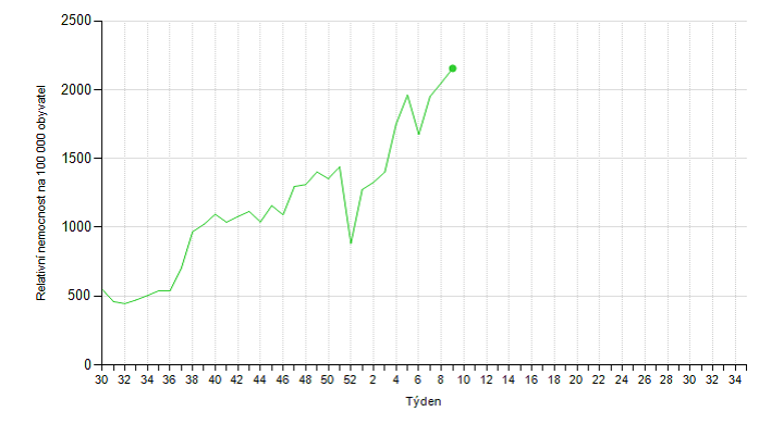 V 9. kalendářním týdnu tohoto roku se celková nemocnost akutními respiračními infekcemi včetně chřipky oproti předcházejícímu týdnu v České republice ještě mírně zvýšila, a to o 1,5 % a dosáhla hodnoty 1 984 nemocných na 100 000 obyvatel.