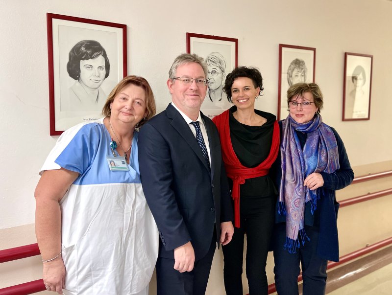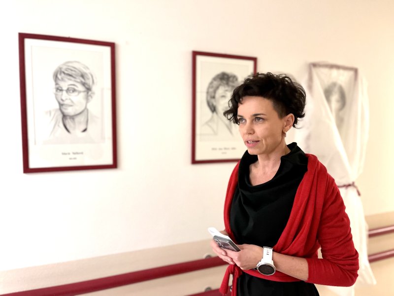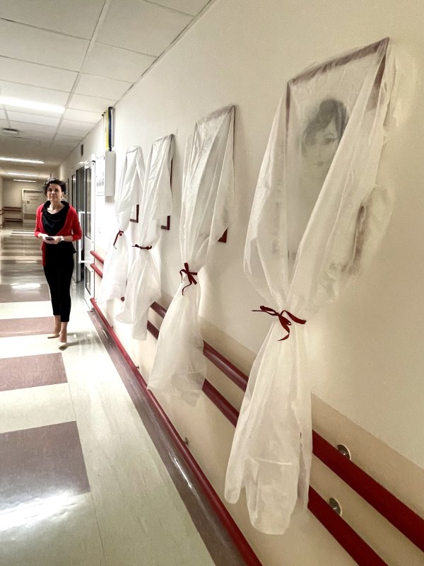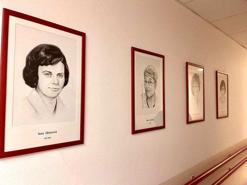Kreslené portréty z dílny umělkyně Mgr. Alžběty Čechové zdobí místo, které spojuje řídící úsek s lůžkovou částí oddělení.