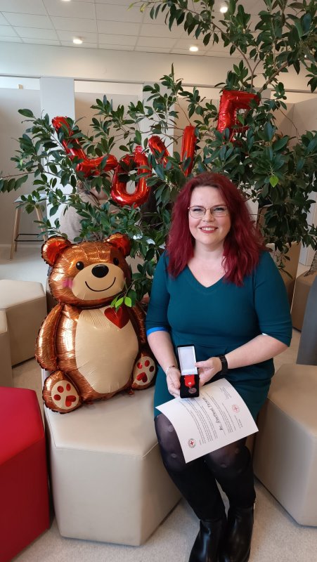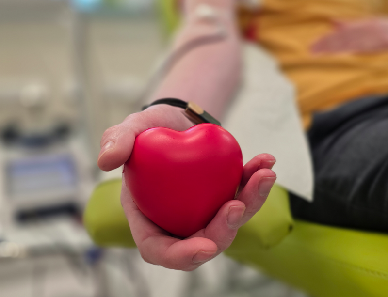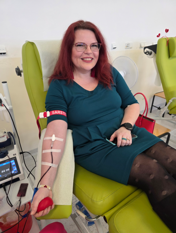 Mezi dárci, kteří na tento odběr přišli, byla i paní Tereza, pro níž má speciální význam. „Je to proto, protože jsem začala darovat krev přesně před třemi lety právě na valentýnském odběru. Takže dnes si připomínám své výročí. Od té doby daruji krev pravidelně,“ vzpomíná na začátek své dárcovské cesty paní Tereza, která se za tu dobu stala nadšenou dárkyní. Oceňuje i milý přístup personálu, a proto dnes přinesla každé sestřičce malou pozornost ve formě květiny. „Mám to tady moc ráda, je zde skvělá atmosféra a jsem šťastná, že můžu pomoct někomu dalšímu,“ říká Tereza, která si na tento odběr vzala i stylový doplněk. „Je to náramek se srdíčkem, který mi darovala kamarádka. Slíbila jsem, že jí náramek vyfotím, aby věděla, že mi dneska pomáhal při odběru,“ vypráví a fotí si přitom svou paži. Kromě tříletého výročí ode dne, kdy se stala dárkyní krve, ale slavila ještě jednou: dnes totiž absolvovala svůj desátý bezpříspěvkový odběr, za který byla oceněna bronzovou medailí prof. Janského. Přišla sice sama, ale i tak si odběr velice užila. „Partner by daroval rád, ale bohužel mu to nedělá dobře, navíc měl pracovní povinnosti, takže mě nemohl ani přijít podpořit,“ říká Tereza, která by chtěla v příštích letech chodit ještě častěji, tedy čtyřikrát do roka, což je u žen maximální počet odběrů plné krve za rok.
