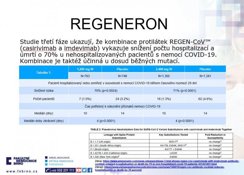 /6.4.2021/ Až o 70% méně hospitalizací a úmrtí v souvislosti s nemocí covid-19 vykazuje 3. fáze klinické studie posuzována Evropskou lékovou agenturou po podání protilátkové kombinace REGEN-CoV™ (casirivimab, imdevimab) od Regeneron Pharmaceuticals. Výsledky studie současně prokazují účinnost na všechny známé mutace viru SARS-CoV-2. Kriticky důležité je včasné podání kombinace monoklonálních protilátek pacientům v počínající fázi nemoci s lehkými příznaky bez nutné potřeby kyslíku.