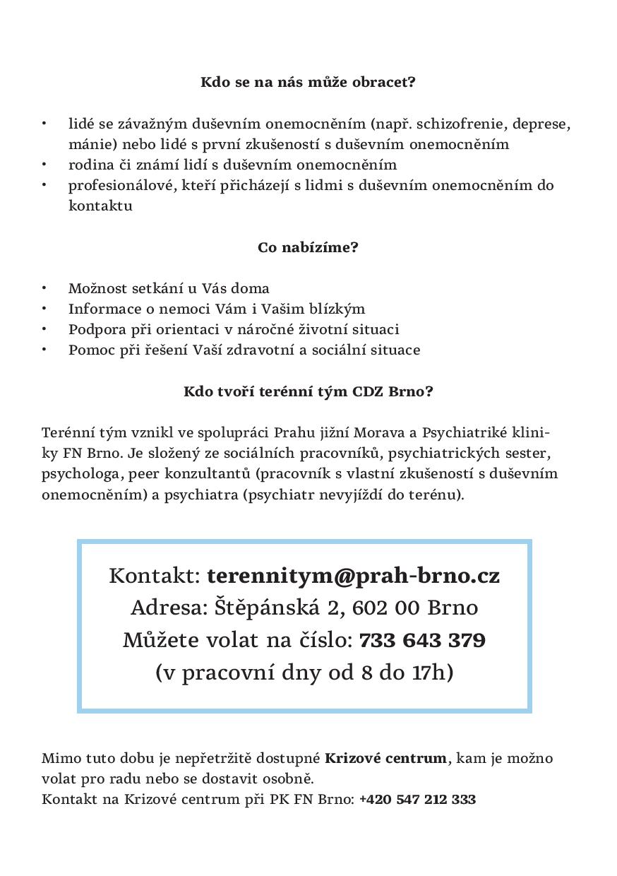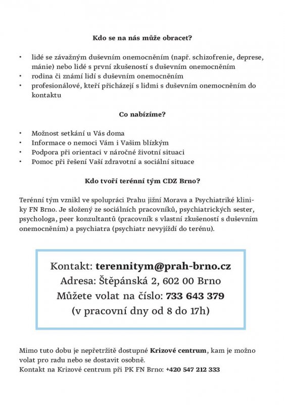 V květnu roku 2017 jsme oficiálně vyhlásili vznik Centra duševního zdraví Brno (CDZ Brno), které existuje díky spolupráci poskytovatele zdravotnických služeb – Psychiatrické kliniky FN Brno – a poskytovatele sociálních služeb – Práh jižní Morava, z.s. Je to první CDZ v Jihomoravském kraji, třetí v ČR.