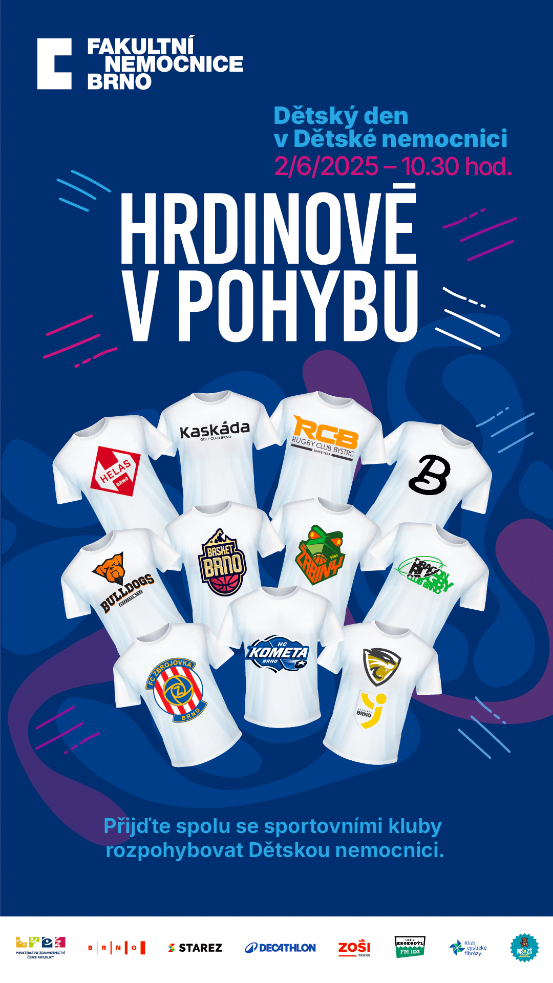 Slavnostní podpis memoranda o spolupráci FN Brno, pracoviště Dětská nemocnice na projektu „Hrdinové v pohybu“ a brněnských sportovních klubů a celý sportovní den v Dětské nemocnici začne v pondělí 2. června 2025 v 10:30 hodin za účasti ministra zdravotnictví prof. Vlastimila Válka, primátorky města Brna JUDr. Markéty Vaňkové, ředitele FN Brno MUDr. Iva Rovného, MBA, zastupitelky města Brna pro oblast PR a marketingu Bc. Kateřiny Jarošové, MBA, náměstka léčebné a preventivní péče v Dětské nemocnici MUDr. Davida Starého, Ph.D., MBA, MHM, a zástupců brněnských sportovních klubů – Rugby Club Dragon Brno, Kometa Brno, Basket Brno, Bulldogs Brno, Rugby Club Bystrc, Zbrojovka Brno, Baseball Draci Brno, Žabiny Brno Basketbal, Volejbal Brno (muži), Volejbal Šelmy Brno, Golf Club Brno a Helas Brno futsal.