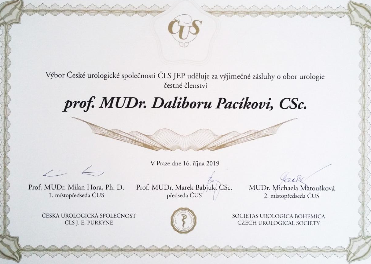 Vedení České urologické společnosti ČLS JEP udělilo přednostovi Urologické kliniky FN Brno a LF MU prof. MUDr. Daliboru Pacíkovi, CSc., čestné členství České urologické společnosti za výjimečné zásluhy o obor. Prof. Pacík byl takto oceněn jako vůbec první urolog z Brna a Jihomoravského kraje. Ocenění předal prezident odborné společnosti prof. MUDr. Marek Babjuk, CSc., v rezidenci primátora hlavního města Prahy.