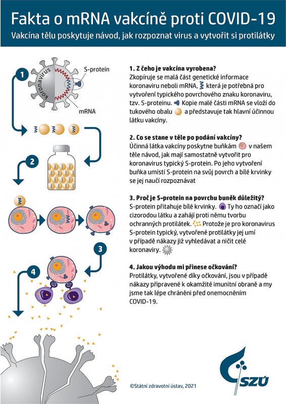 - Po zavedení mRNA do buněk se po omezenou dobu vytváří bílkovina, kterou daná mRNA kóduje. Většinou se jedná o takové bílkoviny, struktury viru, které vyvolávají virus neutralizační odpověď.