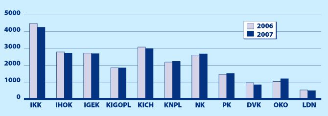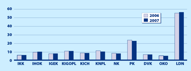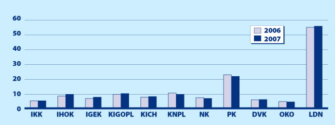 Metodika zpracování dat: Rozdíl v datech stavu LM – celkem (skutečnost) v roce 2007 a počtem úvazků, na které jsou výkony přepočítány, se na operativě nepodílejí. Počet operačních sálů je přepočítán podle skutečně využívané kapacity, kdy údaj 0,2 představuje využívaný jeden pracovní den za týden.