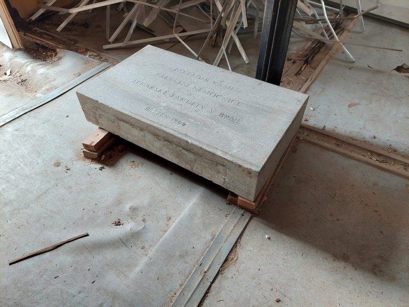 Co se týče základního kamene zmíněné výstavby z roku 1969, ten se v průběhu času a vlivem mnoha společenských změn postupně ztratil a mělo se za to, že se už v areálu FN Brno ani nevyskytuje. O to větší bylo překvapení zaměstnanců Odboru hospodářsko-technické správy, když ho na jaře 2024 objevili při bourání a stěhování unimobuněk ve staré zástavbě nedaleko pavilonu F.